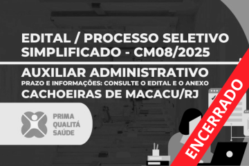 A Organização Social Prima Qualitá Saúde divulga processo seletivo simplificado, em unidades de saúde do município de Cachoeiras de Macacu/RJ. Para participar, o candidato deverá realizar inscrição, cadastrando seu currículo no link indicado no Edital. Confira abaixo, o edital simplificado e todas as informações sobre o processo seletivo. Acreditamos na Ler mais