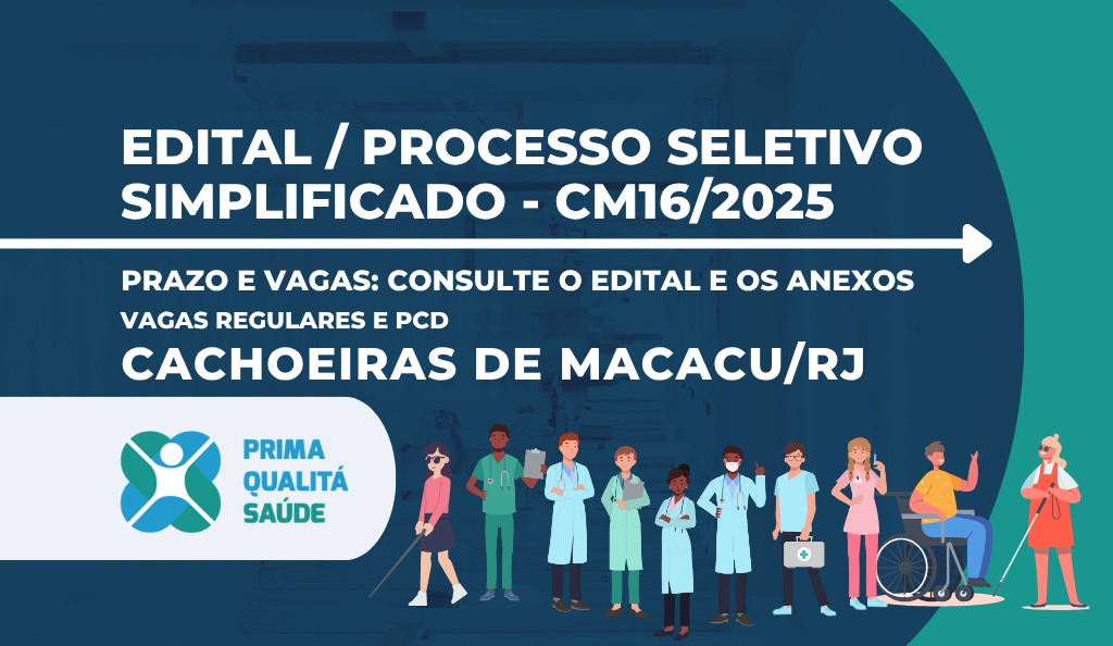 A Organização Social Prima Qualitá Saúde divulga processo seletivo simplificado, em unidades de saúde do município de Cachoeiras de Macacu/RJ.