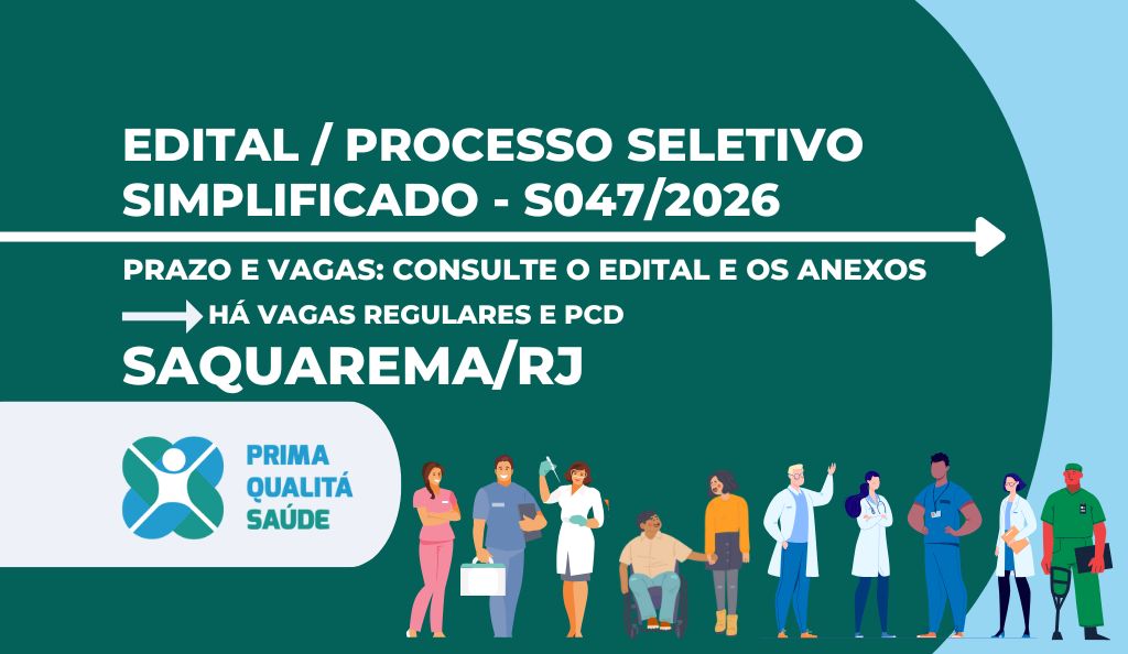 A Organização Social Prima Qualitá Saúde divulga processo seletivo simplificado, em unidades de saúde do município de Saquarema/RJ.